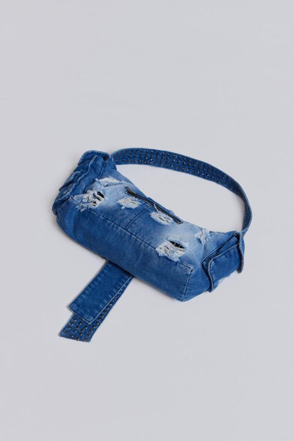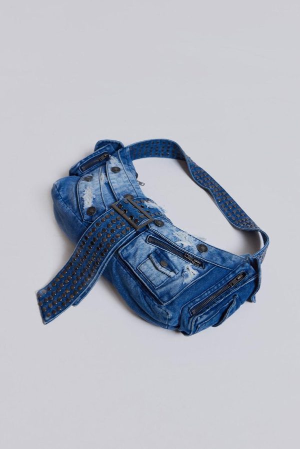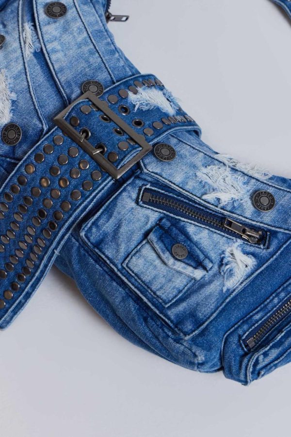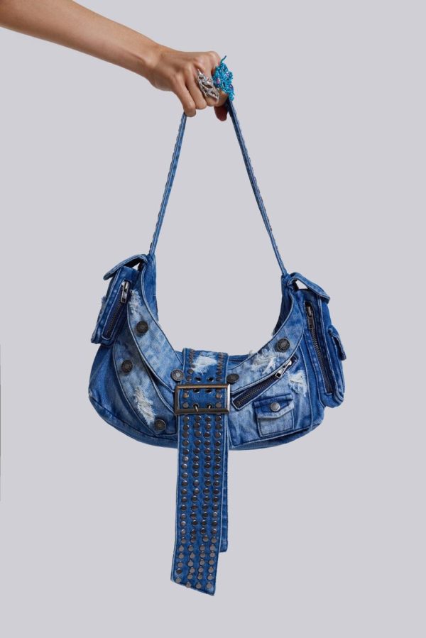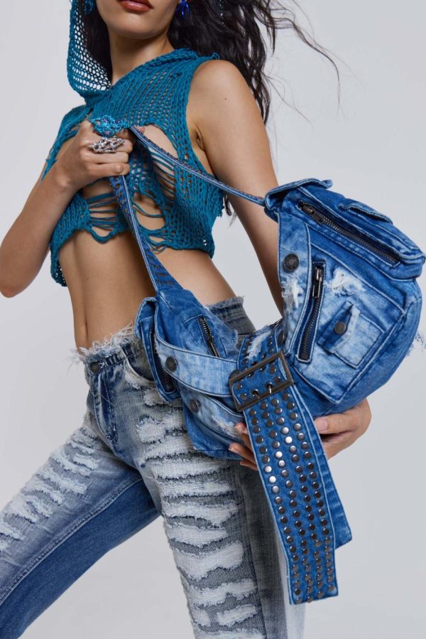 Complete your look with the Amoral Studded Shoulder Bag – crafted from a washed blue denim fabric, this shoulder bag features multi pockets, distressing detail and an XL belt buckle complete with hardware details.