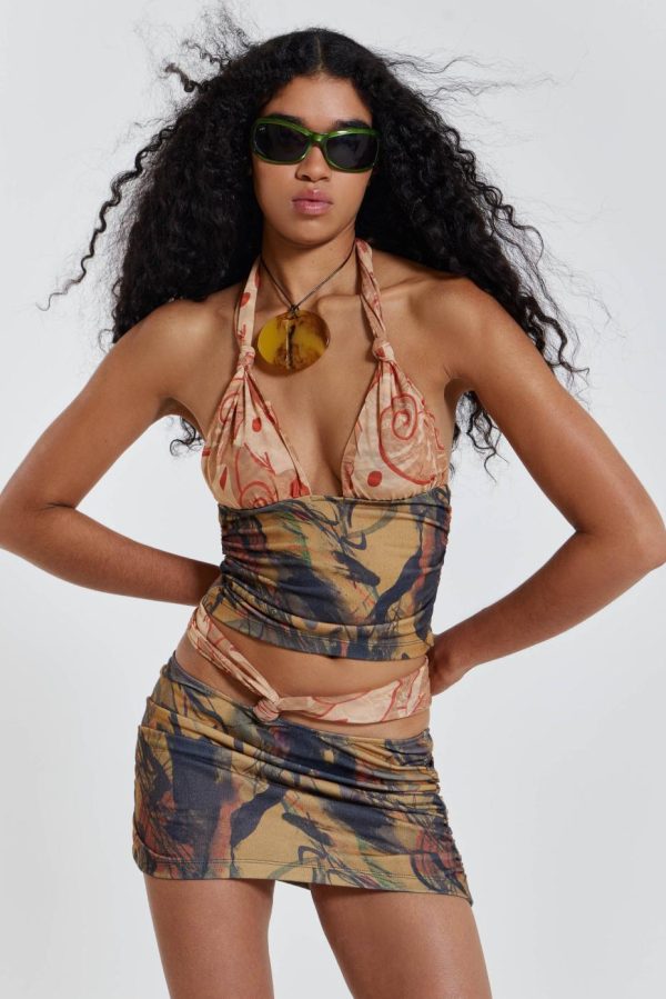 The Ammos Skirt is crafted in an earthy print lightweight fabric with a gathered front with knot detail, featuring a mini length and cut out sides. Complete the ensemble with the matching beach top.