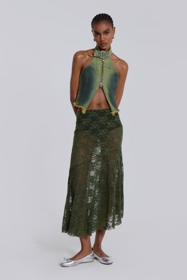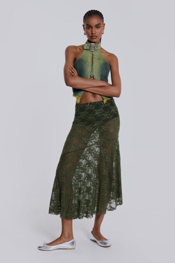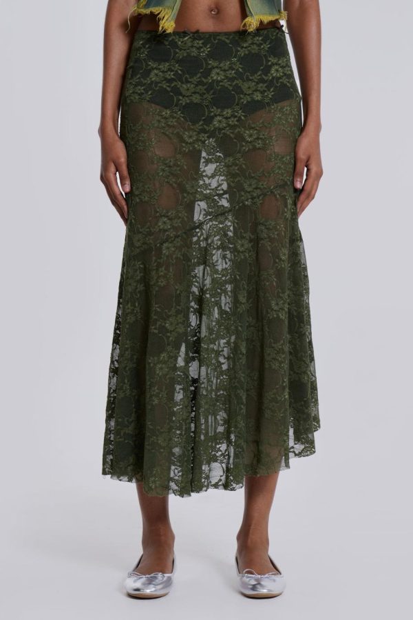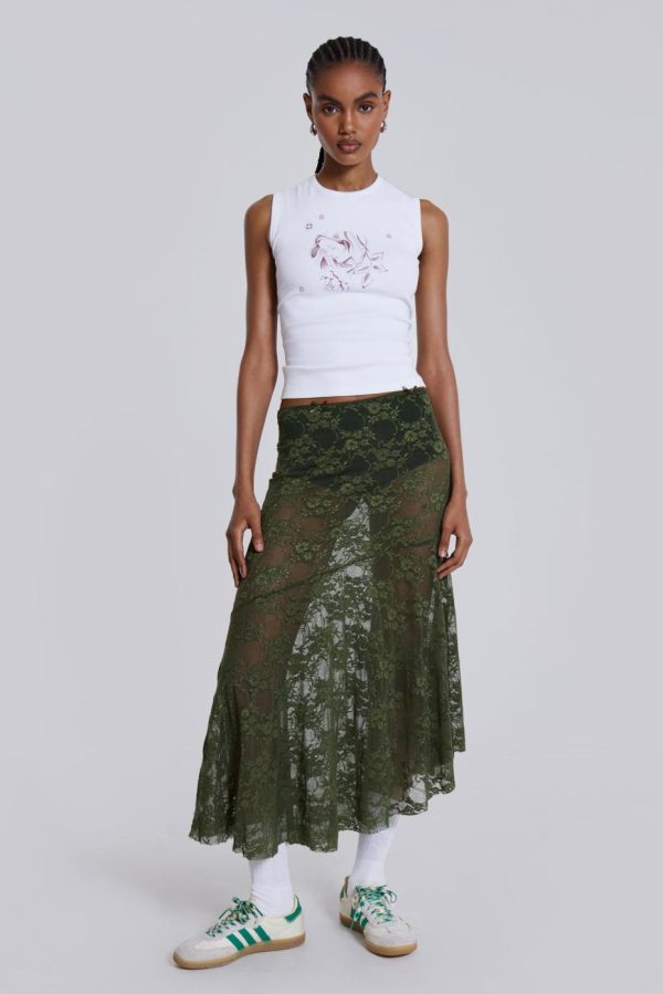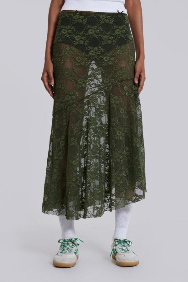 Refresh your wardrobe with the Rhea Khaki Lace Skirt. Crafted from a lightweight sheer lace fabric, this khaki green midi-length skirt has a fluted silhouette with a scalloped elasticated waist with a ribbon bow detail.