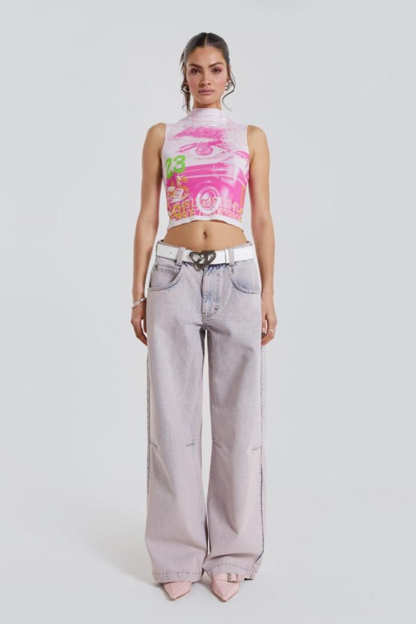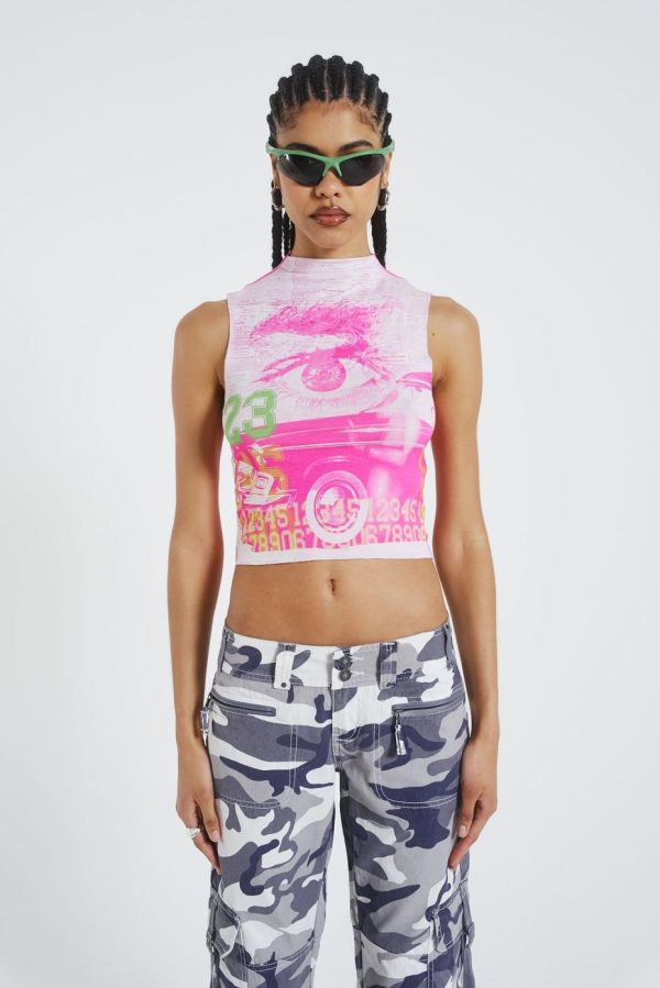 This retro collage printed tank top is crafted in a lightweight jersey fabric with a raw edge finish for a touch of texture, finished with a high neck and sleeveless design.