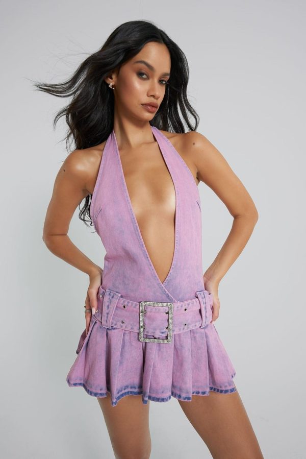 Elevate your wardrobe with our pink denim mini dress. Accented with a plunge front, open back and halter neck, this wrap over design stands out with its detachable diamante belt and stud detail.