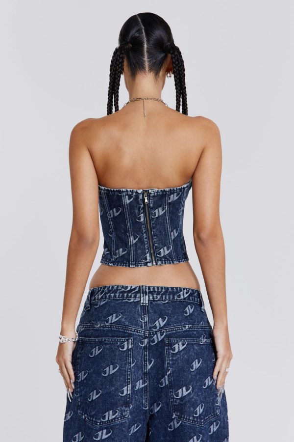 The Monogram Strapless Corset Top is crafted from a blue denim which features monogram embossed detailing. The corset style top features angled seams with boning structure. Cropped to a bardot shape, this corset top adds a refined touch to any ensemble when paired with the matching jeans.