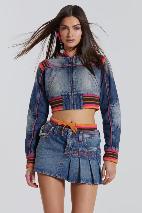 Introducing the Sherbet Cropped Denim Jacket. Constructed from heavyweight denim and decorated with piping detail, this cropped fit is finished with ribbed collar and cuffs. Complete the look with the matching mini skirt.