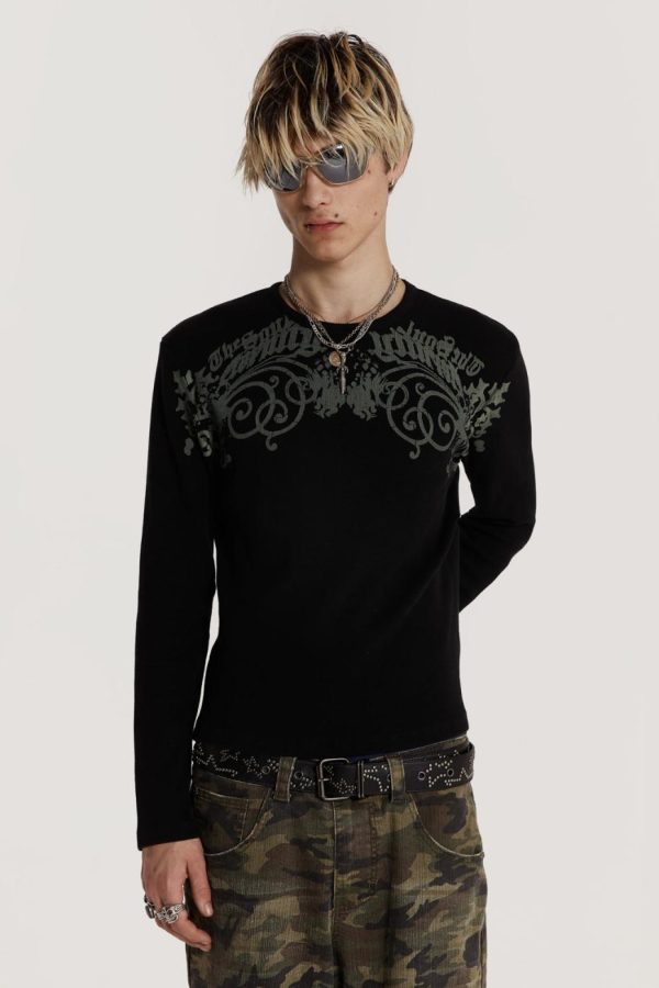 A washed black long sleeve top in a waffle fabric with a gothic print across the chest.