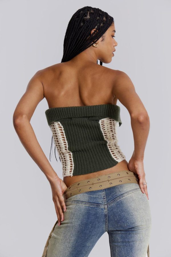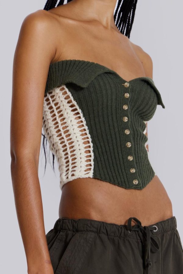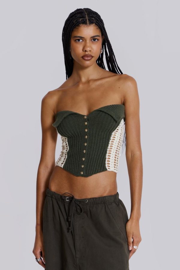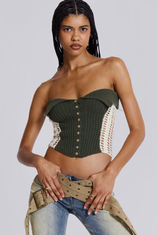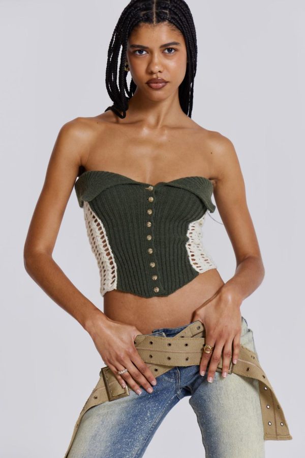 Elevate your wardrobe with this knitted corset top, crafted in a khaki green knitted fabric with cream side panels, this strapless corset top is complete with a button up front.