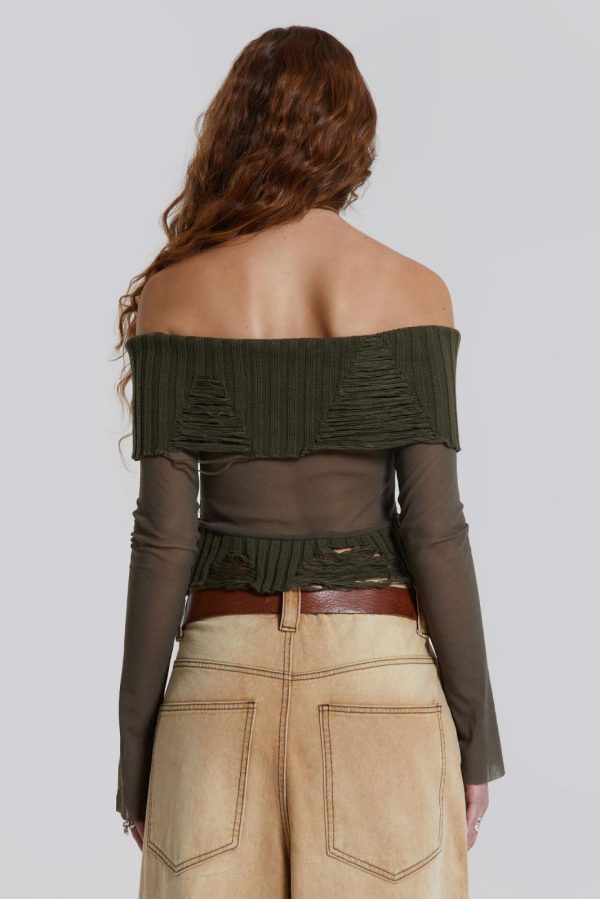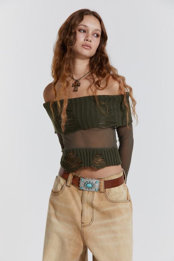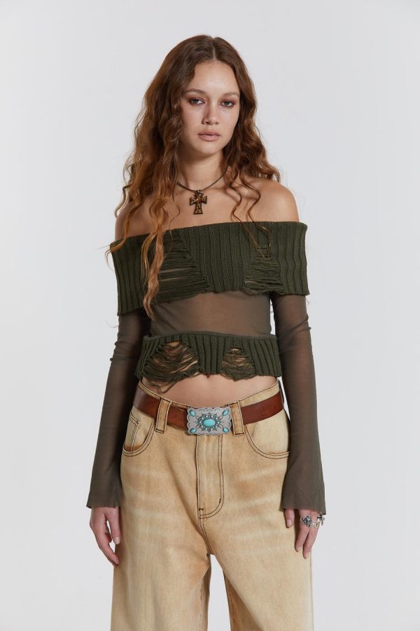 The khaki green Nova Off The Shoulder Mesh Top is the perfect addition to your wardrobe. Featuring long flared sleeves and a raw edge finish along with a shredded distressed shoulder neckline.