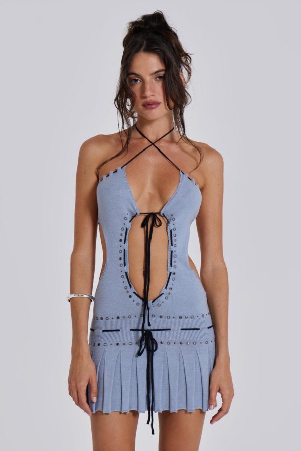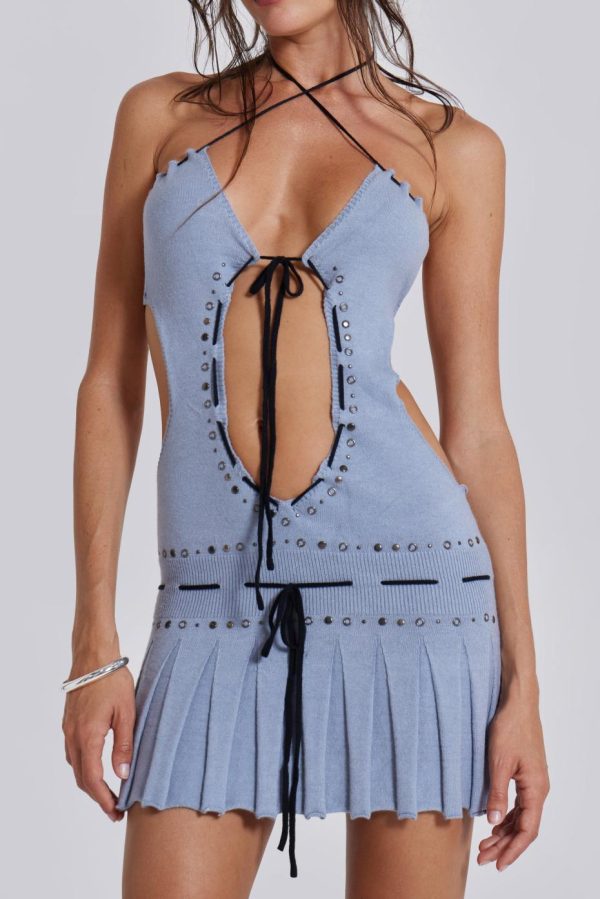 This grey-blue knitted mini dress with its backless design and pleated skirt make a truly distinctive statement. Classically edgy black straps tie at the waistband and two back straps, crossing at the neck. It’s finished with antique silver and gunmetal hotfix studs at the cut out and waistband, exuding a timeless elegance.