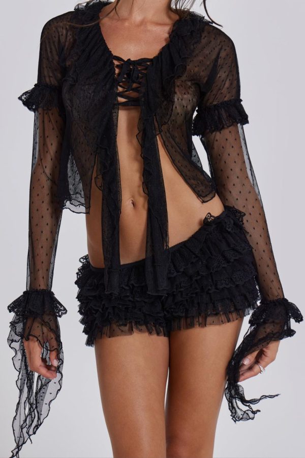 Enhance your look with this black flamenco frill tulle blouse – crafted from a dotted tulle fabric, this lightweight sheer blouse is adorned with double layer ruffle frills, long fluted sleeves and a lace up front. Co-ordinate this blouse with the matching shorts for a complete look.