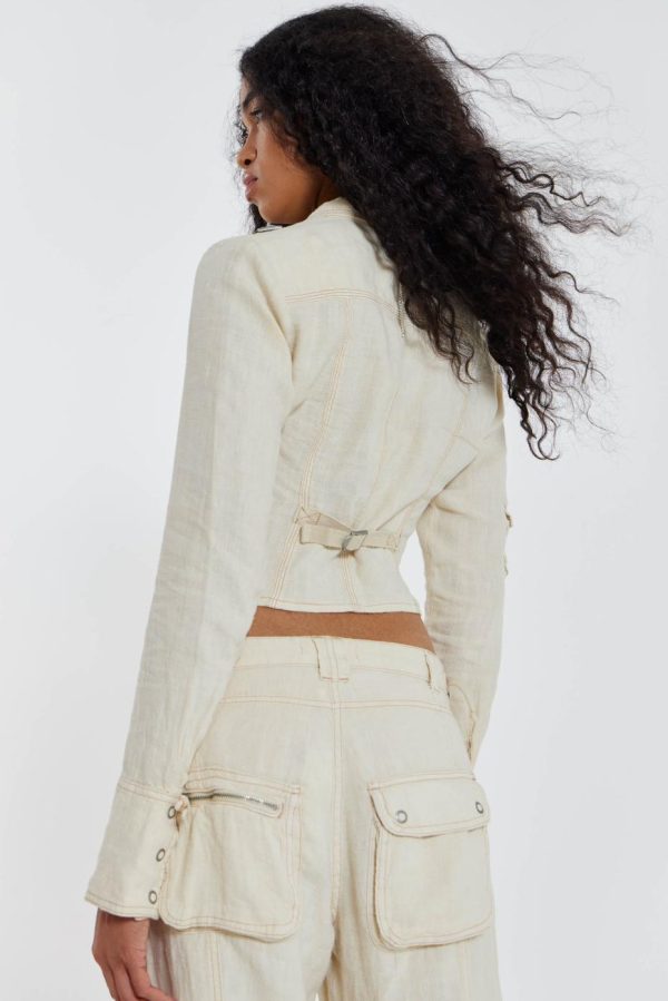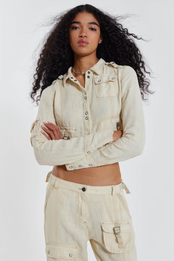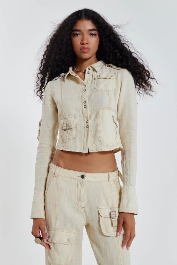 Refresh your wardrobe with the Santal Cargo Shirt. Crafted from an ecru linen fabric, this Y2K style cargo shirt features contrast camel stitching, antique silver hardware and functional cargo pockets. Complete the ensemble with either the matching cargo skirt or cargo trousers.
