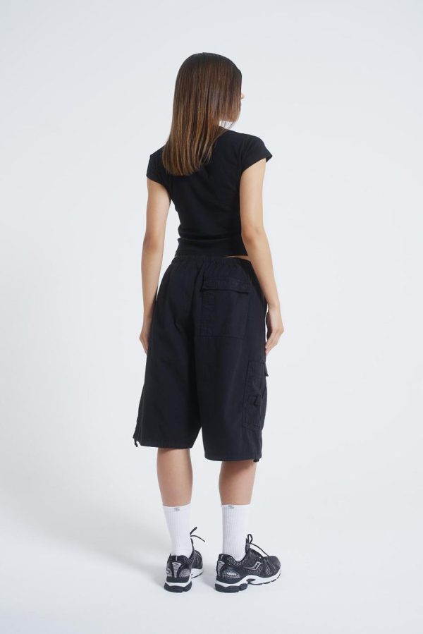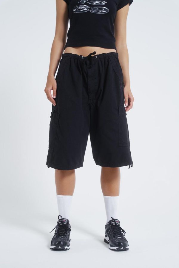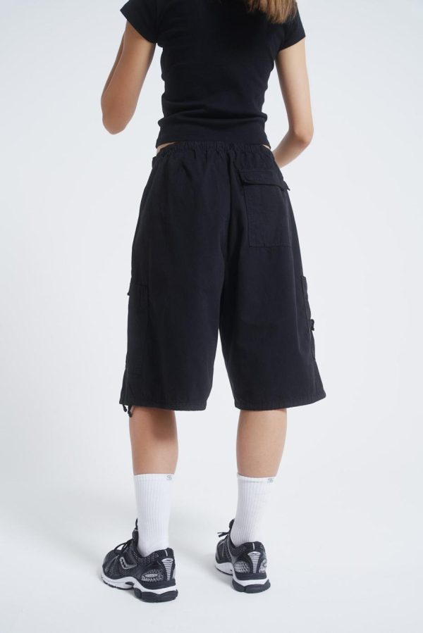 Discover the unparalleled comfort and style of the Black Parachute Cargo Shorts. These shorts feature an oversized fit and six-pocket styling, accompanied by an elasticated waistband and adjustable cotton drawcord for added flexibility.