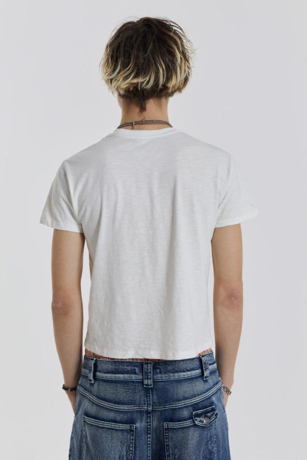 Crafted in a lightweight cotton jersey slub fabric, this off white tee features a reverse side slogan screen print, rib bound neck and distressing on the hem and neckline which gives the piece a heavy vintage washed look.