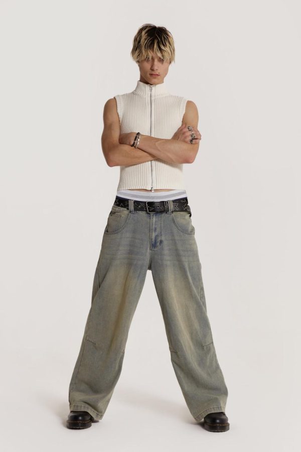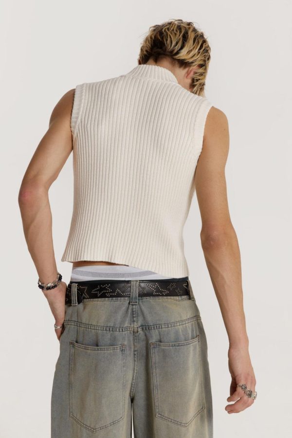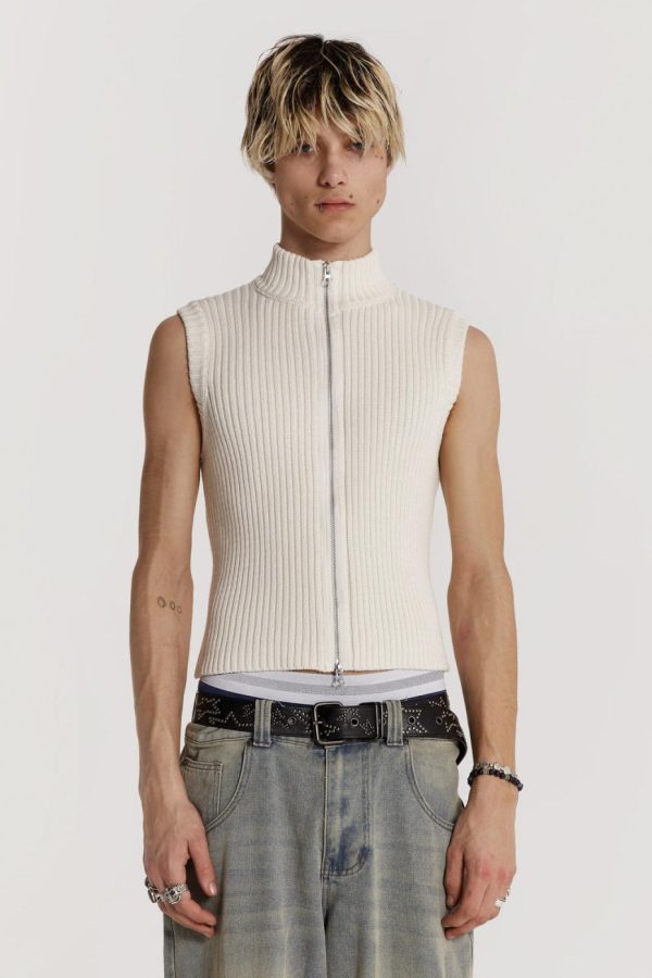 The Polar Vest is crafted from ecru ribbed knit and features a zip through front with a funnel neck.